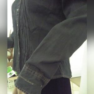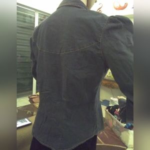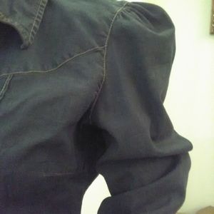BEAUTIFUL JEAN SHIRT , A LITTLE DISTRESS IN AREAS, DONE BY DESIGNER. THE FRONT HAS THOSE EXTRA PRETTY LAYERS ADDED AND THE SHOULDERS Have THAT PUFFINESS TO THEM. THE COLOR IS PRIMARILY BLUE, BUT THERE ARE SOME BLACKISH Colors JN IT ALSO. PTP ABOUT 19 1/2 AND LENGTH IS ABOUT 23 in.