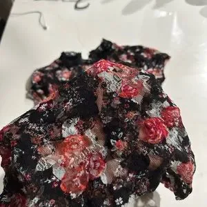 Beautiful floral lace top. Neck lace with two buttons on the back and ruching on both lateral bottom part of the top.