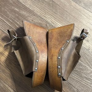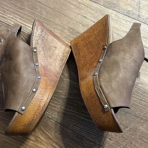 Wood bottom with faux suede and silver studs- one stud missing on inside as pictured