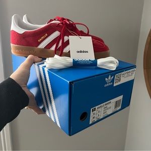 Brand new in box adidas gazelle in Scarlett with white. MENS size 5.5 which is approx a women’s 7-7.5. I am a true 6.5 and these are too large. Heel to toe measurement is 10 1/4”. Sold out style!