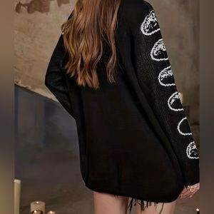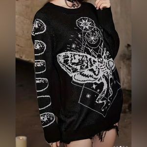 Beautiful graphic Dead Head Moth lightweight sweater features amazing graphics on front and sleeves, lightweight acrylic, loose boxy fit and light stretch. Sweater does not have frayed edges at the bottom (see pics on hanger).