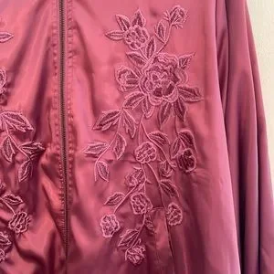 torrid size 3 skinny pink bomber jacket with embroidered rose pattern. zips open and has open pockets on both sides. some picks in the fabric on the sleeves- otherwise in good condition!