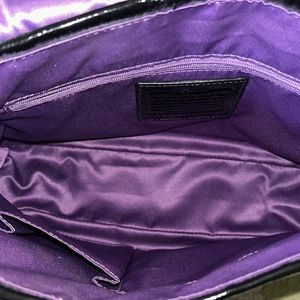 Interior is lined in purple satin fabric with a zipper pocket on one side and 2 open pockets on the other side