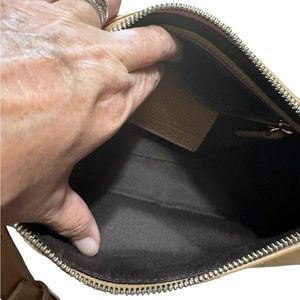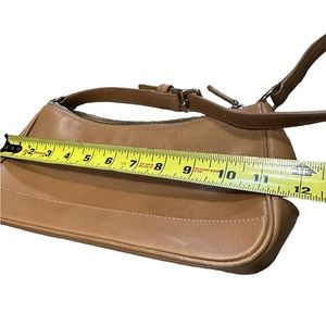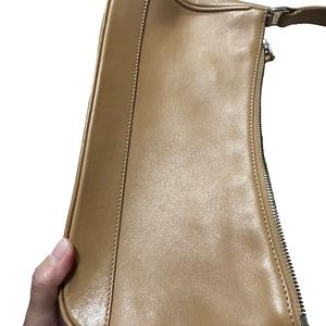 Coach brand tan leather shoulder bag purse. Smaller sized. Zip closure! Dark brown interior with one zip close pocket. Adjustable strap. Has a few scratches on outside of leather, inside looks unused. Please see all photos. Like new!
