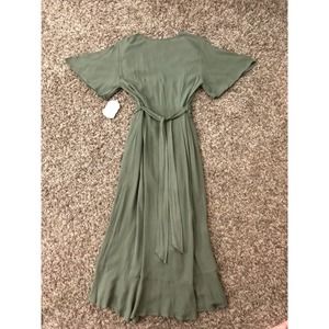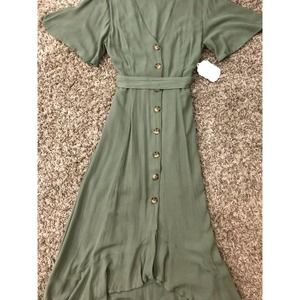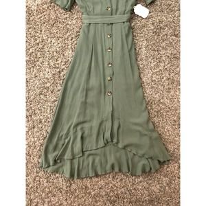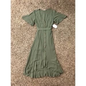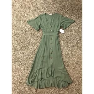 Altar’d State NWT button down, tie waist, flutter sleeve, ruffle hem, olive green maxi dress size XS