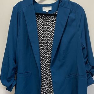 Women’s size 2X. Pretty black and white ikat print lining. Front slit faux pockets. Cute ruched 3/4 sleeves. Lots of details to make this a special piece. Great quality!