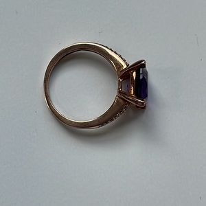 Genuine 3 ct. Amethyst Cushion Cut Round Stone…14K Rose Gold over Sterling Silver Ring.. With Lab Created White Sapphire Stones on Sides…Size 6 1/2….3 1/3 ct. Total Weight..Prong Setting… Polished Finish