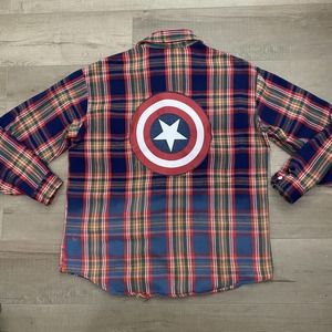 UNIQUE Vintage JCPenney Big Mac Captain America Flannel Shirt Mens L USA Made. Possibly a custom made shirt. Captain America logo slightly peeling and some paint discoloration as shown in photo. Otherwise, shirt is in great condition. Fast shipping. From non-smoking homes.