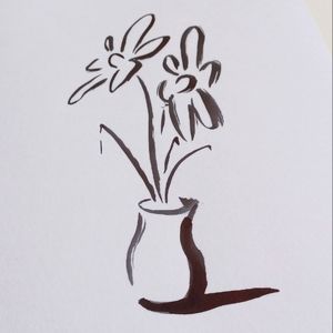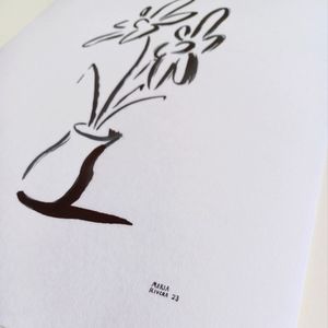 ORIGINAL ART 2 Flowers in Pot by Maria Rivera. 9x12" Black Ink Wall Art Painting