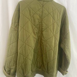 Army green, quilted with full zip front, mock neck, long sleeve & quilted with side-slash pockets. Brand new without tags, never worn, zero flaws. 99% Cotton, 1% Spandex. Machine was cold gentle cycle. Tumble dry low heat.