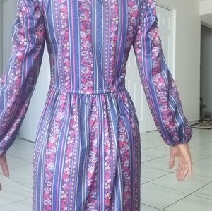 High neck balloon sleeve blue and white polkadot print and blue red and yellow vertical stripes with red purple and canary floral daisy pattern.
