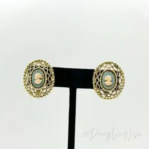 Vintage Gold Badge with Blue & White Silhouette Earrings