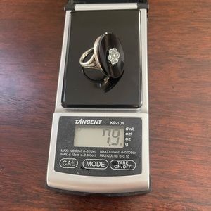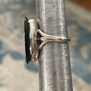 This is an absolutely gorgeous antique style / Victorian style black onyx & bluish grey pearl solid sterling silver size 6.75 ring. The oval onyx is 26mm long. The ring weighs 7.9 grams. Stamped sterling inside its shank. In excellent vintage condition.