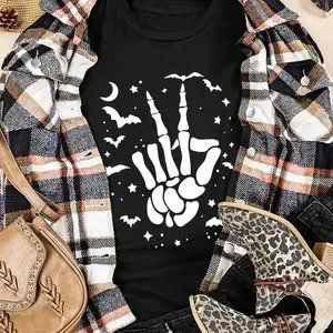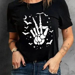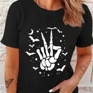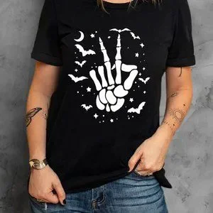 Black Halloween Bat & Skeleton Hand Graphic Tee