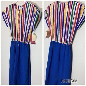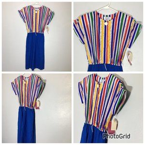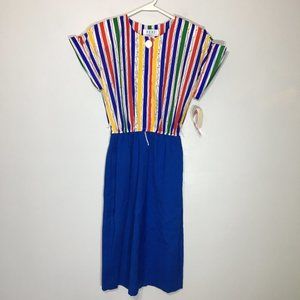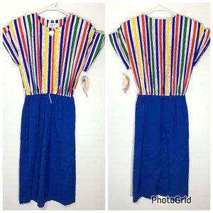 VIntage 1980s colorful and bright rainbow striped dress. Great clowncore aesthetic. Fun 80s bright dress with one large button at neck and then clear hidden buttons to waist.