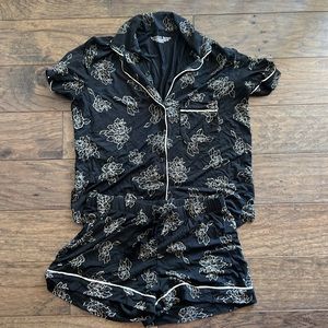 Victoria’s Secret Modal short pajama set, size , black and white floral print, buttery soft modal with touch of four way stretch, short sleeve button up with matching shorts, easy fit, elastic drawstring waist, 3” inseam, decorative piping, machine wash, new without tags