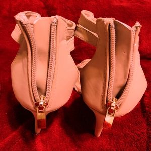 The shoe has a double ankle strap that is joined together with gold buckles in the front and a gold zipper up the back of the heel. The toe strap also has a beautiful gold buckle.