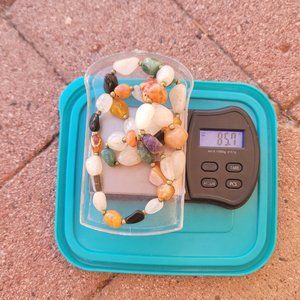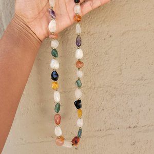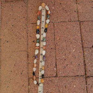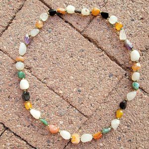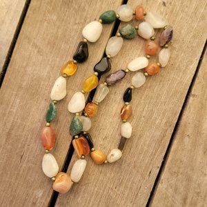 Really fascinating piece of fine vintage quality! Feautures an awesome combination of different colored semiprecious chunky polished stones include amethyst, agate, quartz, and obsidian. A rainbow of colors - orange, white, green, purple, black, yellow...tiny brass ball beads in between. Stones are natural and organic. Stones makes the necklace heavy. A long necklace and perfect for layering, but equally amazing on its own. See pictures for measurements. In good vintage condition. Absolutely stunning for your collection!