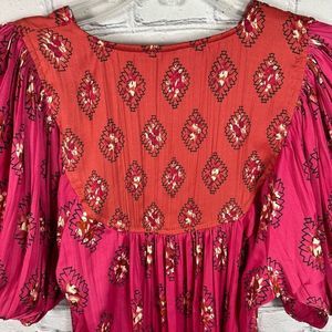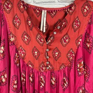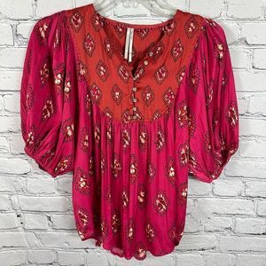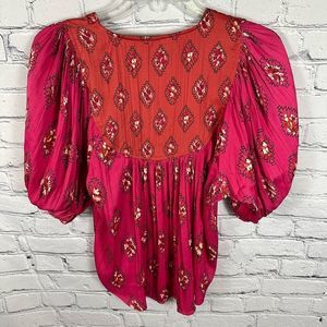 Anthropologie Women’s Top Puffed Sleeve Ikat Floral Henley Relaxed Pink & Red XS