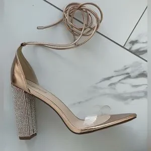 Rose Gold clear tie up shoes with rhinestone heels.