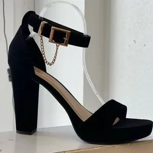Black platform heels with chain details.