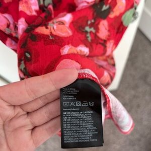 Red floral long sleeve mini dress from H&M. No stains/damage. Worn once to a wedding. Body con around the bottom. Deep Vneck. Not ideal if you have a small chest. Shoulders are poofy (like padded almost, but not). Perfect for fall. Measurements are laying flat length, pit to pit and waist.