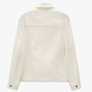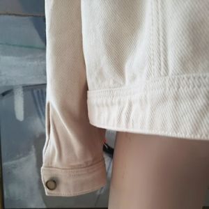 Jean jacket made of an ivory or natural denim fabric features a lapel collar, long sleeves with buttoned cuffs, large patch pockets at hip, cropped length, and tucked details along front button closure.