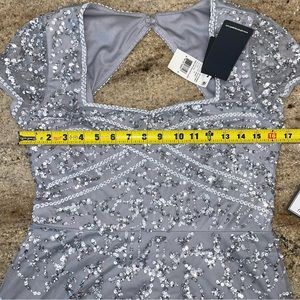 back cutout, fit & flare silhouette, mesh construction with sequin embellishment