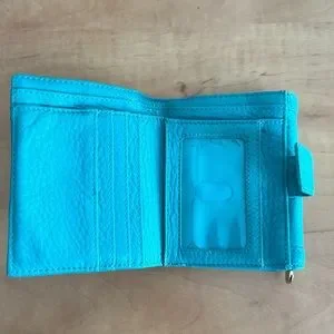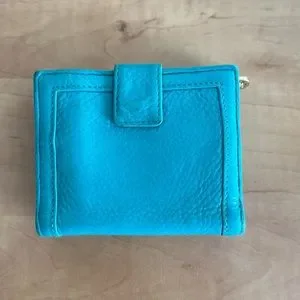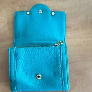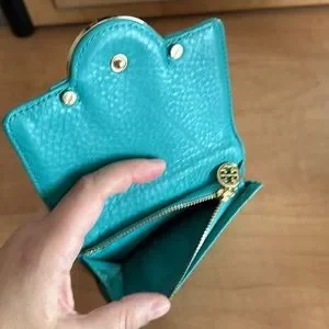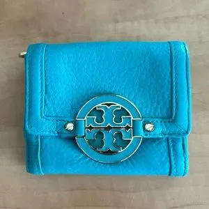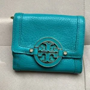 Tory Burch leather wallet in a turquoise colour, colour may vary in light, it’s a bluish green colour, used in good condition, some hardware discolouration please see photos. Thanks 😊