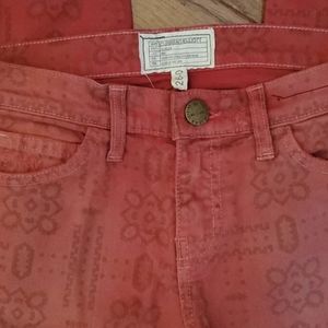 Color: Red Coral Bandana Style/Design #: 1280-0554 Material: 98% cotton, 2% elastane Details: * A faded, destroyed bandana print detail trend-now colored jeans with a lean, ankle-length silhouette ending in slim tapered hems. Zip fly with button closure, five pocket silhouette, belt loops. Cotton/elastane. Machine wash. Made in USA. * 14.5" waist, 26.5"L.