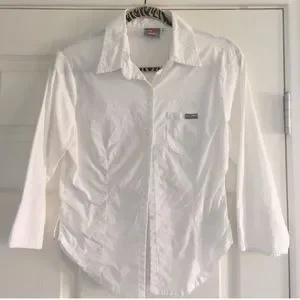 Vintage O'Neill white button down shirt, size large juniors (runs small). Form fitting, 3/4 length sleeve with cuff. 96% cotton, 4% spandex. EUC