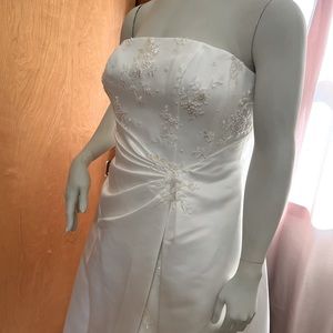 Ivory draped front wedding gown with lace inserts and full train. Cleaned, pressed and bustled. Waistline is 40”, bust is 44” and the hip measurement is 54”. The length is 60” hollow bone to hem.