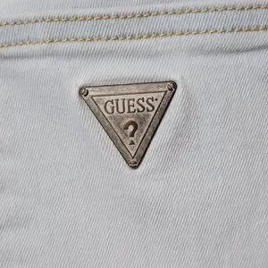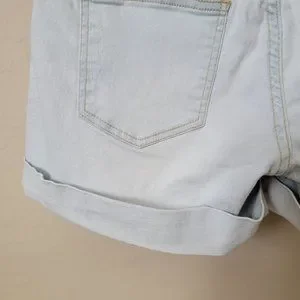 Guess denim shorts, size 27. Light wash. Distressed. Destroyed. Stretch; stretchy. Roll up short. Folded cuff (cuff is stitched and does not unroll); cuffed. Whiskering. Shorts zip and have a button fly closure. Signature Guess triangle metal patch on back pocket. Spring. Summer. Beach. Casual. Streetwear. Outdoor. Coastal Cowgirl. Boho. Festival. Hippie.