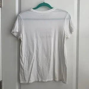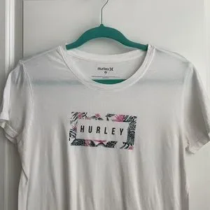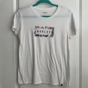 Beautiful white tee shirt with green and pink floral logo on the front.