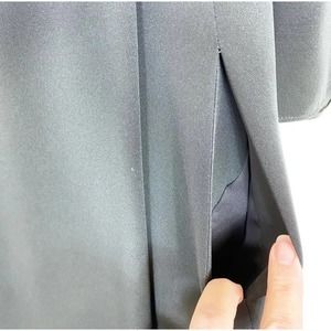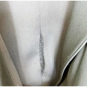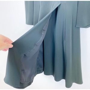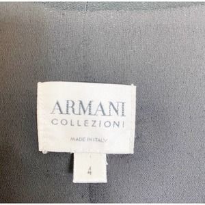 This Armani Collezioni faux wrap dress is black, has long sleeves, a v-neck with a collar and has a hidden side zipper. **The belt is missing and there is a rip on the inside back seam of the lining only. It is not noticeable when wearing. See pictures.**