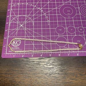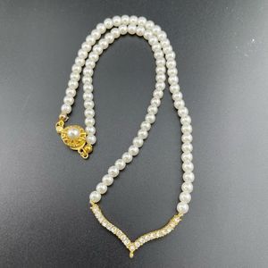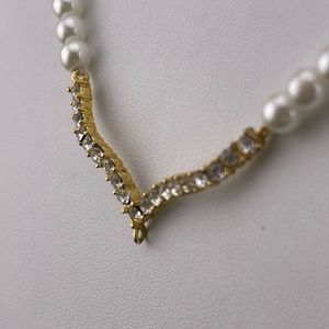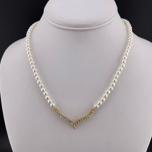 Vintage Faux Pearl and Clear Rhinestone V Shaped Necklace Gold Tone