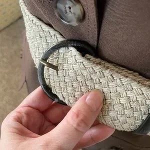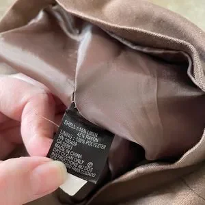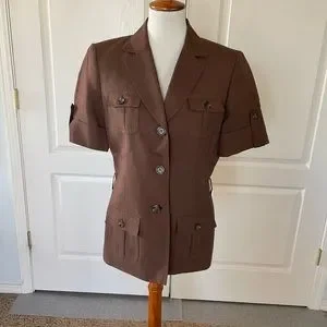 This is a great vintage style blazer. It has an explorer or safari vibe to it. Fits tts. Linen blend with short sleeves makes it doable in warmer weather. The coating on the belt buckle has started coming off. Still usable or can replace with your own.