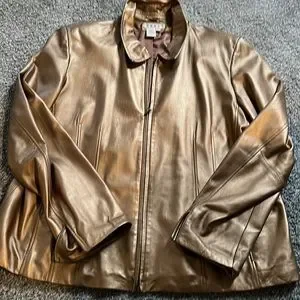 Cold water Creek, size 2X, shell 100% leather, 100% polyester, gold, side pockets, 26 length,23 inches pit to pit. Great for the holidays