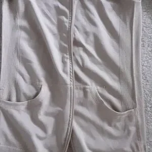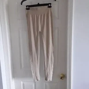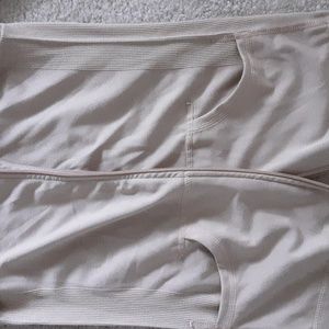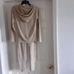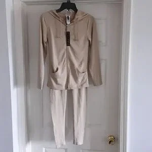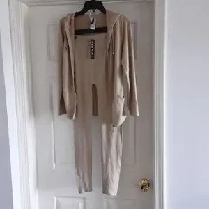 2 piece tan jacket and leggings set jacket has a hood and side pockets with front zipper. leggings has a high waistline.
