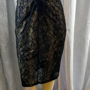 black lace midi cocktail dress, back slit, adjustable straps, zips back. lined, and some stretch of both lining and black lace knit. size 8