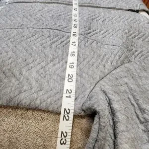 Torrid brand quilted zig-zag stitch athletic collar zip front jacket. Frayed seam peplum waist. Outside is gray with an offwhite interior. Super soft Rayon/Cotton/Polyester blend material.