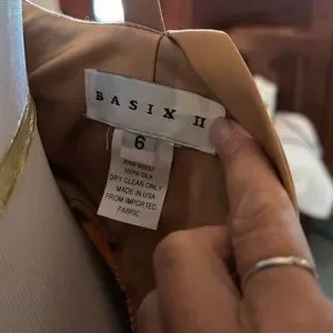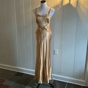 Worn once for a few hours. Gorgeous silk gown. Very comfortable and the back is beautiful jewel.