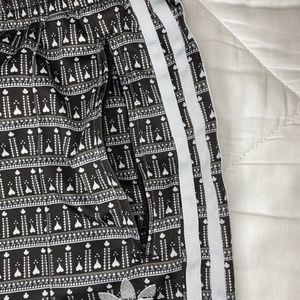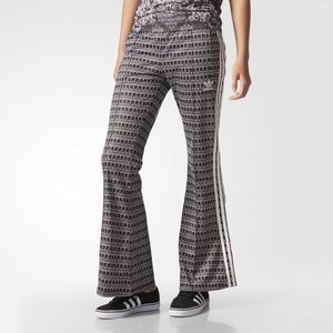 Women's flared Adidas track pants in black and white print. They have been professionally hemmed to have 26 in inseam.