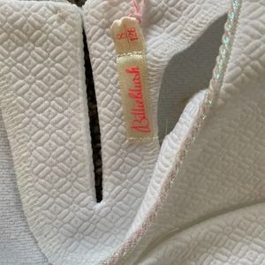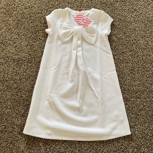 Stylish and comfortable for girls, this white dress by Billieblush is made in soft patterned jersey. It has a large bow design on the front, iridescent trim on the neckline, and fastens with a pearl button on the back.