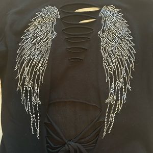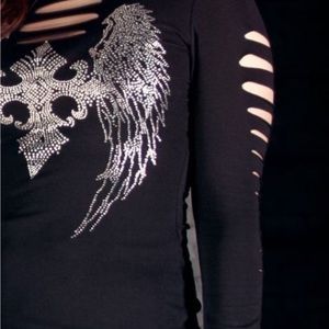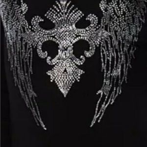 Liberty Wear soft and lightweight long sleeve shirt. Stunning embellished front and back, no stones missing. This is brand new, I cut the tag off but never wore it. I still have the tag. The back is super cute with a slit and tie, slit arms. 95 cotton, 5 spandex. Runs true to size as a large, approximate measurements are, length 25”, sleeve 23”, bust 17” across front. Smoke free pet free home.