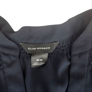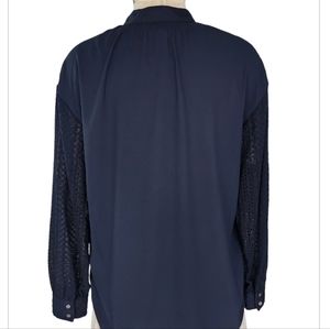Club Monaco Navy Blue Crepe Embroidered Lace Sleeve, loose fitting style, relaxed fit, partial band collar, shirring, split neckline, unlined, hidden 4 buttons closure, dropped shoulder, double button cuffs, classic length, Ho-lo curved hemline, measurements are length 26" armpit to armpit 22" every order coming with complementary extra item.