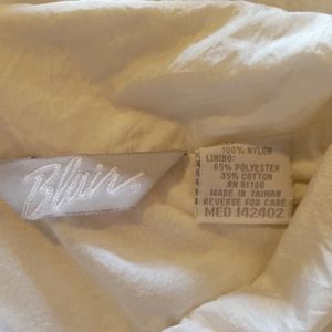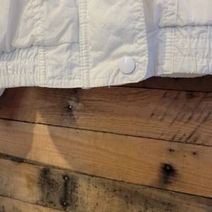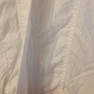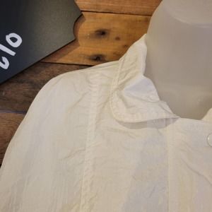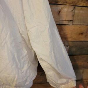 this is one of the cleanest wind breakers I ever seen for being white! I found one orange pen mark spot on the left shoulder. it is located right where the seem for the arm starts. long sleeves. has the zipper that goes from neckline to hemline. the zipper is hidden behind a flap and one snap button at the top and the bottom. even the zipper is white! has wing style sleeves. the sleeves line doesn't actually start till almost the elbow. there is elastic at the end of the sleeves. and elastic at the hemline also. with this being a wind jacket it does have a cloth interior lining. has a small simple collar. found no other issues or flaws. smoke free home and pet friendly home.