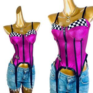 This pink metallic futuristic lingerie bustier corset top is magenta pink and has a sweetheart neckline. It has lightly padded cups and a front zip closure. Its ideal for any passionate vintage lingerie collector or for vintage lingerie fashionistas! The Condition is very good-excellent! This bustier top is marked size Medium, and would best fit a size Small/Medium. It has 4 metal garters attached to the bottom. Please measure yourself before buying if you plan on wearing it.