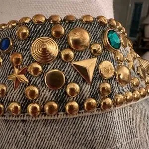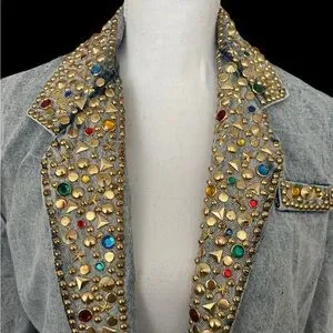 Vintage 80s 90s Y2K Acid Wash Denim Bedazzled Metallic Boho Elvis Vegas Upcycle Gold Jewels Blazer Jacket Coat Casual Gold Maximalist