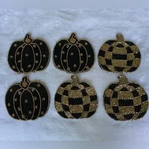 SALE - Rachel Zoe oversized and beaded pumpkin coasters. There are two different beaded designs with a black and gold color scheme. Some of the beading is very reflective, so they look really pretty in the light! These would be a really nice addition to your fall decorating or sitting on your fall themed or Thanksgiving table! There are SIX coasters included in this set!
